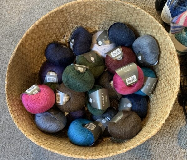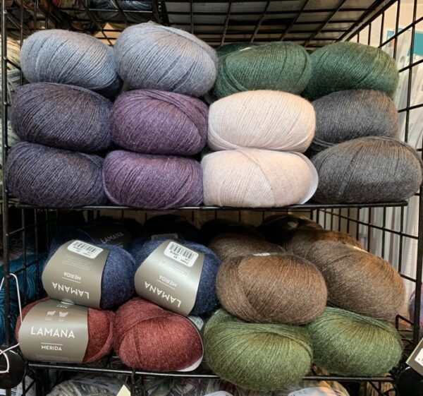 The shop is just stuffed with yarn top-to-bottom, front-to-back, and nothing makes me happier! We finally received our first shipment from Lamana, a European company with a lovely line in yarn and and even better series of design collections. I was conservative in what I ordered because I didn’t know how to process a direct shipment from overseas (many of our European yarn come through a distributor so all that is handled upstream from me.) Everything went smoothly until the package reached US customs. Due to something not explained in full (but I suspect that it was because tariffs changed almost daily and no one knew what to do or that all the customs people were re-assigned to snatching people off the streets or somebody was protecting us from all the dangerous yarn – thanks, US Customs and Border Protection!), the shipment was held up, then the package was lost somewhere in a warehouse in Philly. Lamana replaced it and the yarn (called Merida) finally got here, a dozen rich colors of fingering weight yarn in 50-gram balls:
