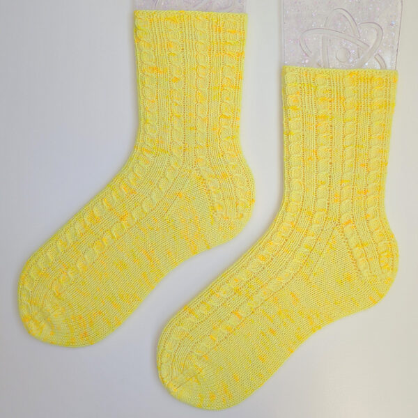 The yarn is a merino/silk/nylon blend that is perfect for socks, especially if you want to try a fancier stitch, like: