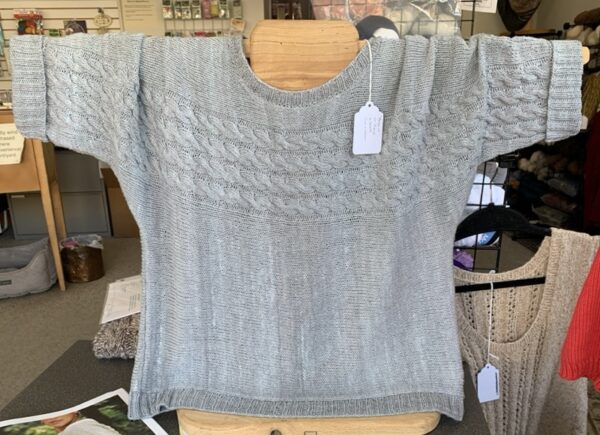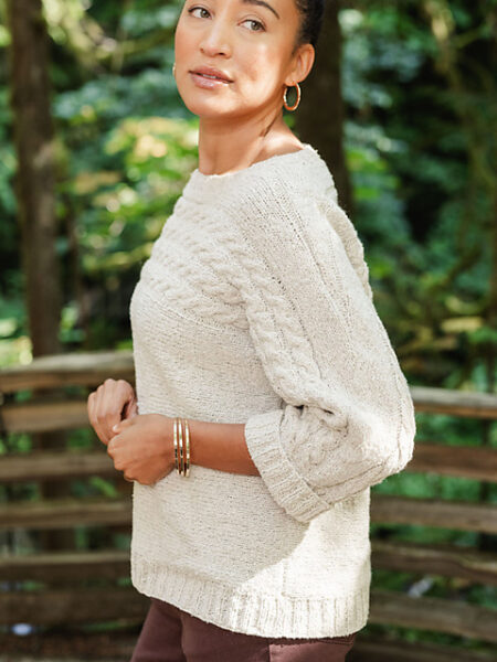It’s done sideways and, while the lines are simple and the cables are easy and repetitive, keeping track of increases and decreases and what row to cast on for the body and what row to bind off, and what row to start the neckline shaping and so on and so on, made it more challenging (and more interesting) than you would think. There’s quite a bit of finishing too, which might make it a good class. I made it in Noro Sonata (thus the color shadings), but Berroco shows it in Remix Light which is a nice 3-season blend:
