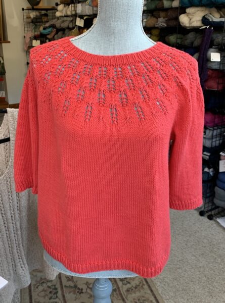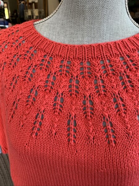 I made it in this summer-y coral just to cheer myself up in the dark of late February. I lengthened the sleeves to just below elbow-length. Closeup of the leaf design on the yoke – pretty!